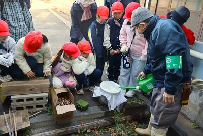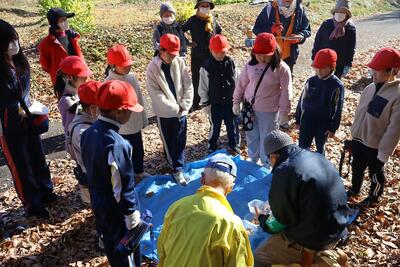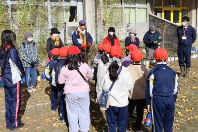 町のシンボルである国蝶オオムラサキの保護を目的として越冬調査が行われ、3年生児童も参加しました。