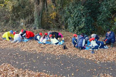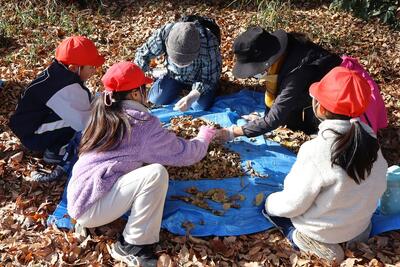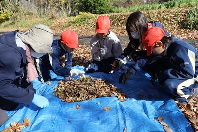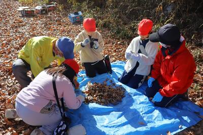 落ち葉を1枚1枚丁寧にめくりながら越冬幼虫を探します。この日は、オオムラサキの幼虫とゴマダラチョウの幼虫をそれぞれ8頭ずつ見つけることができました。そのうちの5頭を七郷小で飼育し、残りはオオムラサキ活動センターで飼育してもらいます。