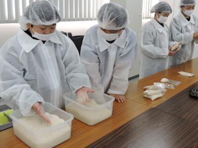 東洋ライスでは、精米された米が無洗米になるまでの過程を学び、実際にもみすりや精米の体験もさせていただきました。また、小麦粉アレルギーの人でも食べられる「米粉パン」を試食させていただきました。