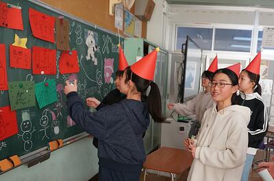 各教室では、新年や3学期にあたっての担任からの温かいメッセージが子供たちを迎えていました。